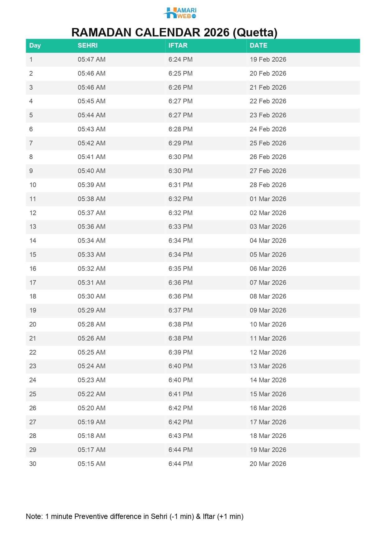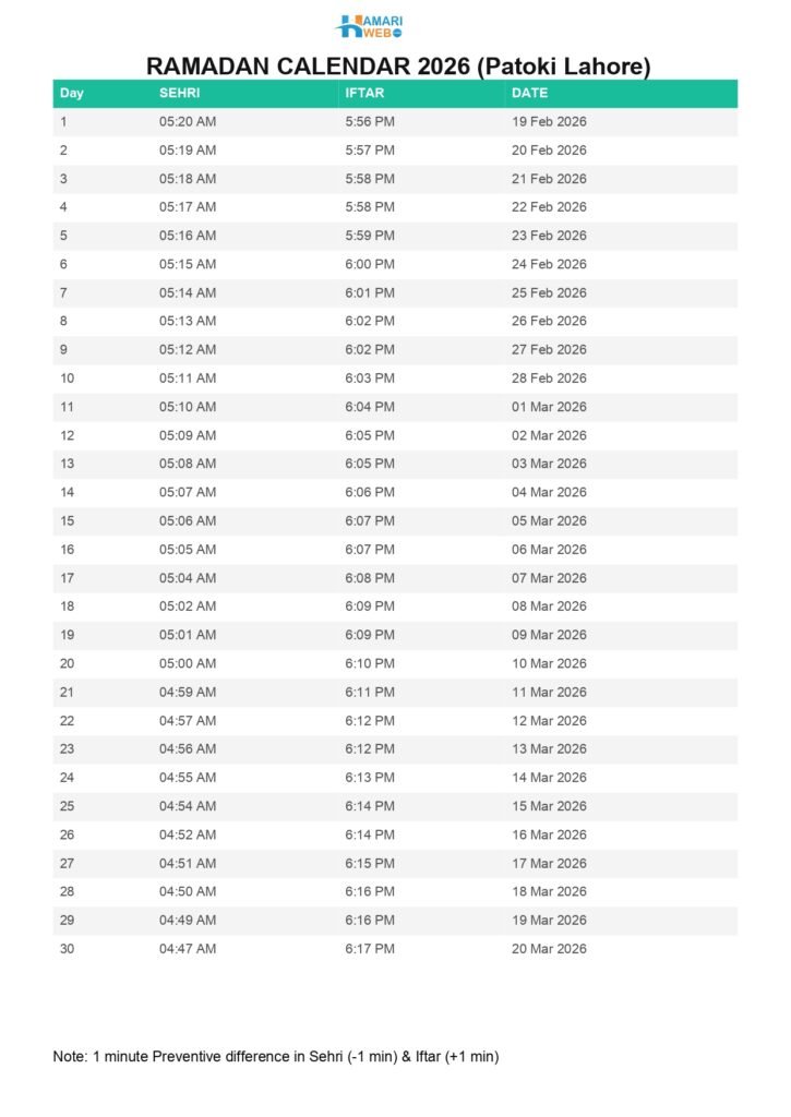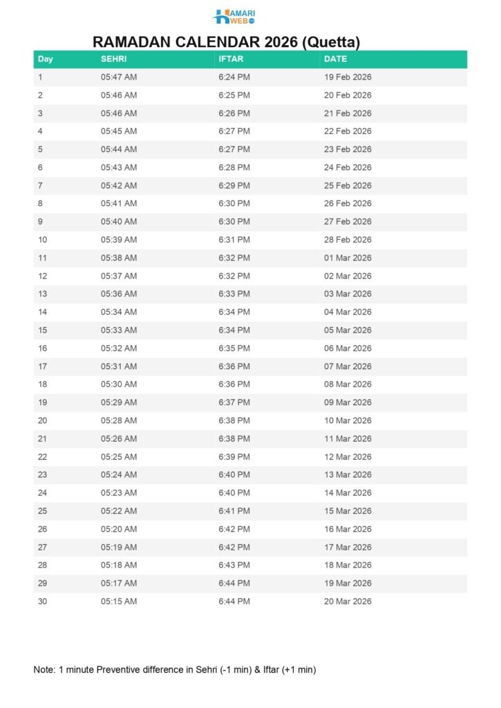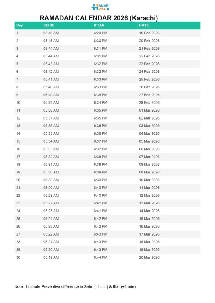 Ramadan Calendar 2026 By Popular Cities of Pakistan